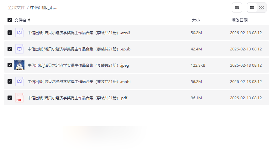 诺贝尔经济学奖,作为社会科学领域的最高荣誉之一,其获奖者的思想深刻影响着全球的经济政策、商业决策与个人生活。本资源《中信出版_诺贝尔经济学奖得主作品合集(套装共21册)》正是这样一座思想的宝库,它系统性地收录了多位诺奖得主的经典著作,由国内顶尖出版机构中信出版社精心编译推出。合集以 AZW3、EPUB、MOBI、PDF 四种主流电子书格式呈现,并附有封面图片,确保了在不同阅读设备上的完美兼容性与阅读体验。这套合集的价值在于,它将散落各处的经济学智慧凝聚一体,为读者提供了一条通往顶级经济思维的捷径,无论是想理解复杂的经济现象,还是寻求个人财富与决策的理性指引,这套书都不可或缺。