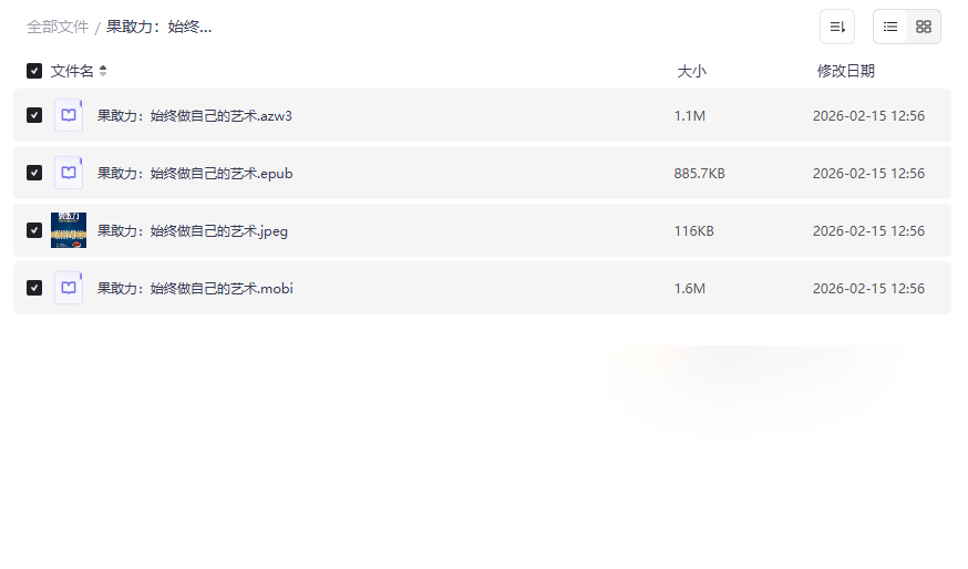 本资源的核心部分,提供了三种主流电子书格式,确保您可以在任何设备上无缝阅读。AZW3格式完美适配Kindle设备,带来最佳阅读体验;EPUB格式作为通用标准,兼容绝大多数手机、平板和阅读应用;MOBI格式则兼顾老款Kindle及其他阅读器。这种全格式覆盖解决了读者的设备兼容性问题,让获取知识与实践“果敢力”的门槛降到最低,真正做到随时随地开启自我成长之旅。 - 高清书籍封面图(JPEG)