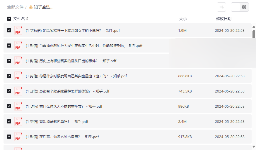 知乎盐选作为知乎平台的高质量付费内容专区,汇聚了众多专业作者和深度文章,涵盖小说、心理、历史、职场、情感等多元领域。本资源合集收录了 2888部精选付费文章,总容量达5.03GB,内容包含热门小说连载、真实故事档案、人性洞察分析、实用技能干货等,堪称“知识宝库”。这些文章多数需付费订阅或盐选会员才能阅读,本合集以PDF格式整理,方便离线阅读与长期收藏,适合: