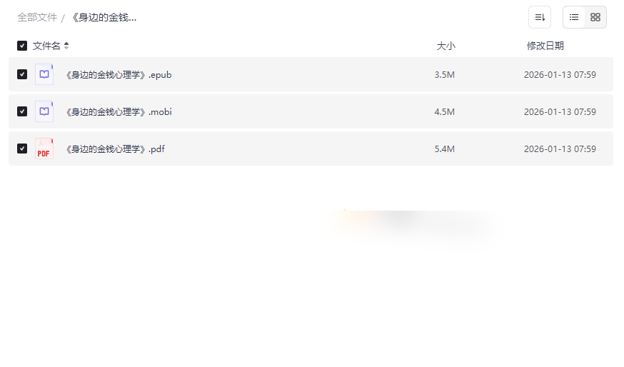 这是目前最通用的电子书格式之一,兼容性强,支持绝大多数阅读软件和电子书阅读器(如苹果Books、多看阅读等)。其亮点在于排版灵活,能够根据阅读设备的屏幕尺寸自动调整文本流,提供近乎纸质书的阅读体验,并支持自定义字体、背景色和笔记功能,是进行深度阅读和标注的首选格式。 - 《身边的金钱心理学》.mobi