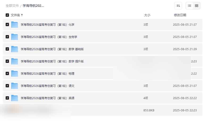 资源按学科独立整理,结构清晰,便于按需取用。其中数学科目细分“基础版”与“提升版”,精准对应不同学力学生: - 基础版:侧重概念梳理与典型例题,适合基础薄弱学生稳步跟进