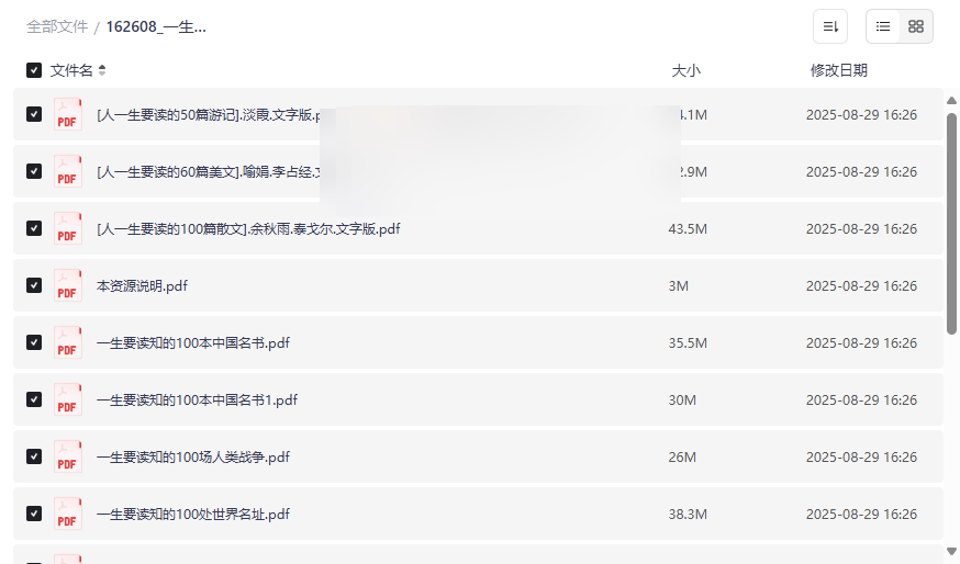 “一生要读系列书籍”是一套精心策划的经典阅读合集,涵盖文学、历史、哲学、建筑、战争与名人传记等多个领域,旨在为读者提供系统化的知识积累和文化熏陶。本资源集合了 50篇精选游记、60篇优美散文、100篇中外名文、100本中国名书、100处世界名址与建筑,以及100位中国名人传记 等丰富内容,通过电子书形式,让读者随时随地沉浸于知识的海洋。这套资源不仅适合日常阅读,还能作为终身学习的参考指南,帮助用户拓展视野、提升人文素养。适用人群包括: