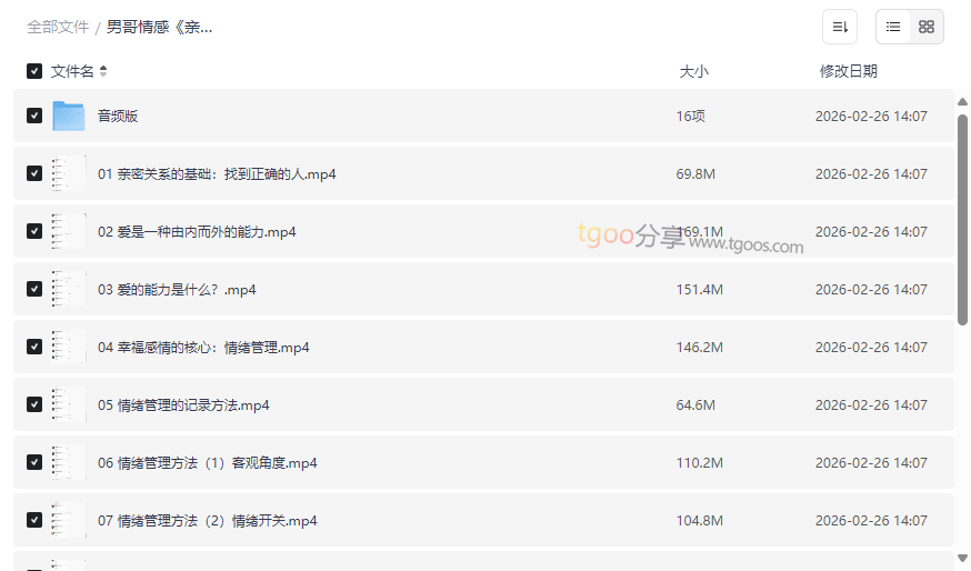 在快节奏的现代生活中,如何建立并维系一段健康、长久的亲密关系,成为许多人面临的共同课题。男哥情感出品的《亲密关系-维护感情必修课》正是为此量身打造的系统性解决方案。本资源集合了 从择偶基础到深度维护的全套视频课程,以及配套的音频版本,将心理学理论与实际情感案例相结合,提供了一套可操作、易上手的亲密关系成长指南。这套高质量情感课程资源尤其适合: