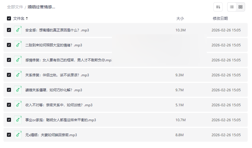 在快节奏的现代生活中,婚姻与家庭关系面临着前所未有的挑战。本套《婚姻经营情感修复课程》正是针对这些普遍存在的痛点,精心整合的超实用家庭问题解决方案。课程内容直击核心矛盾,从安全感缺失、出轨危机、婆媳矛盾到无性婚姻、经济压力等八大关键维度,提供了系统而深刻的音频指导。它不仅是婚姻危机的“急救手册”,更是提升亲密关系质量的“长期保养指南”,旨在帮助伴侣们重建信任、有效沟通,找回家庭的温暖与和谐。这套高质量网盘资源合集尤其适合: