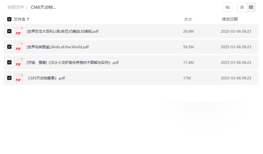 “《365天动物趣事 世界鸟类图鉴》”作为一套精心整理的动物科普电子书合集,汇集了从史前恐龙到现代鸟类的丰富知识,通过高清图文、专业图解与趣味故事相结合的方式,为读者打造一个生动的自然世界探索之旅。本资源包含 5本PDF格式电子书,内容涵盖恐龙百科、全球鸟类图鉴、小龙虾养殖技术及每日动物趣闻,将科学知识与实用技能融为一体,适合:
