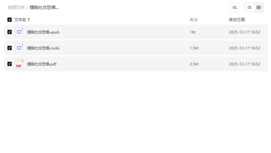 提供EPUB、MOBI、PDF三种主流电子书格式,满足不同设备(如手机、平板、电纸书)的阅读需求。内容涵盖社交恐惧的成因、应对策略及自我训练方法,适合随时随地学习与反复查阅。 - EPUB格式 —— 自适应屏幕,适合移动设备阅读
