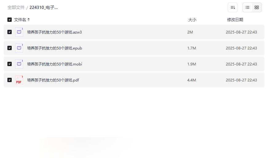 在当今快节奏的社会中,培养孩子的心理韧性和抗挫力已成为家长和教育者的重要任务。《培养孩子抗挫力的50个游戏》这本电子书,通过寓教于乐的方式,将游戏与心理教育巧妙结合,帮助孩子在轻松愉快的氛围中提升应对挑战的能力。本资源集合了 多种电子书格式,包括AZW3、EPUB、MOBI和PDF,确保用户可以在不同设备上灵活阅读和使用。无论是家长、教师还是儿童心理工作者,这份资源都能提供实用的工具和灵感,适用于家庭互动、课堂活动或专业辅导场景。通过游戏化学习,孩子们不仅能增强自信心和情绪管理能力,还能在潜移默化中培养出面对逆境的积极心态。