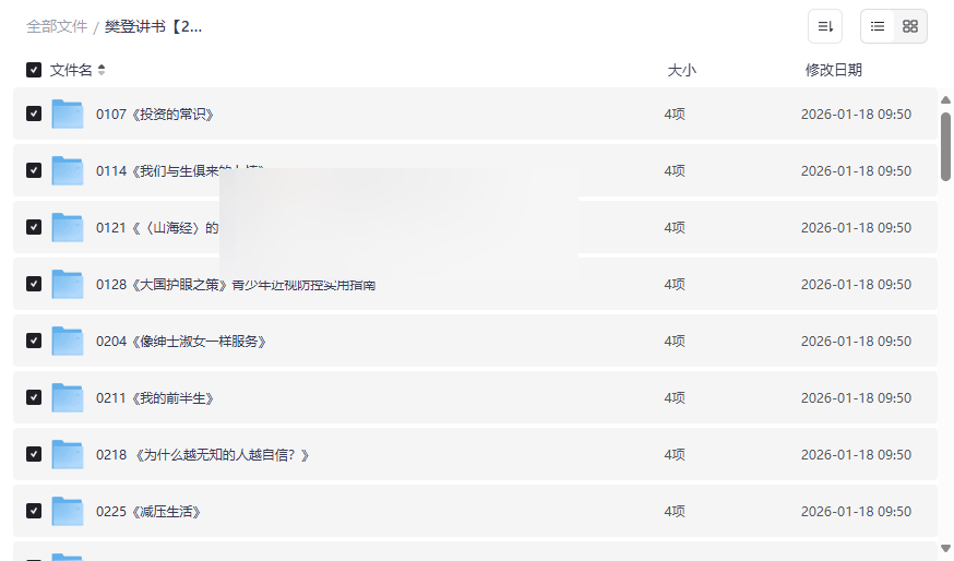 在信息爆炸的时代,高效获取知识精华成为现代人的刚需。樊登讲书以其独特的解读视角和深入浅出的讲述方式,已成为千万用户信赖的知识服务品牌。本资源集合了 2023年全年樊登讲书完整合集,涵盖投资理财、心理学、个人成长、家庭教育、历史文化、健康科普等多元领域。每本书均提供 MP3音频、高清视频、PDF文稿及思维导图 等多格式素材,打造了一个可听、可看、可读的立体化知识库。这套高质量网盘资源合集特别适合:
