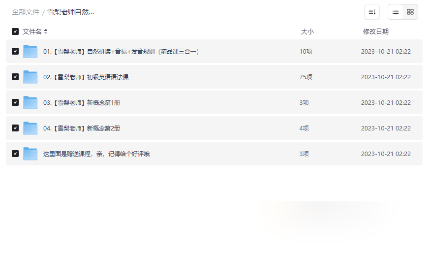“雪梨老师英语课程”是一套全面覆盖英语基础学习的优质资源,整合了自然拼读、音标发音、语法精讲及新概念英语全系列内容,总计容量高达80GB。本资源集合了自然拼读与音标三合一课程、初级语法系统课、新概念1-2册精讲视频、配套讲义课件及丰富赠课,通过生动讲解和结构化教学,帮助学习者系统建立英语能力。适合: