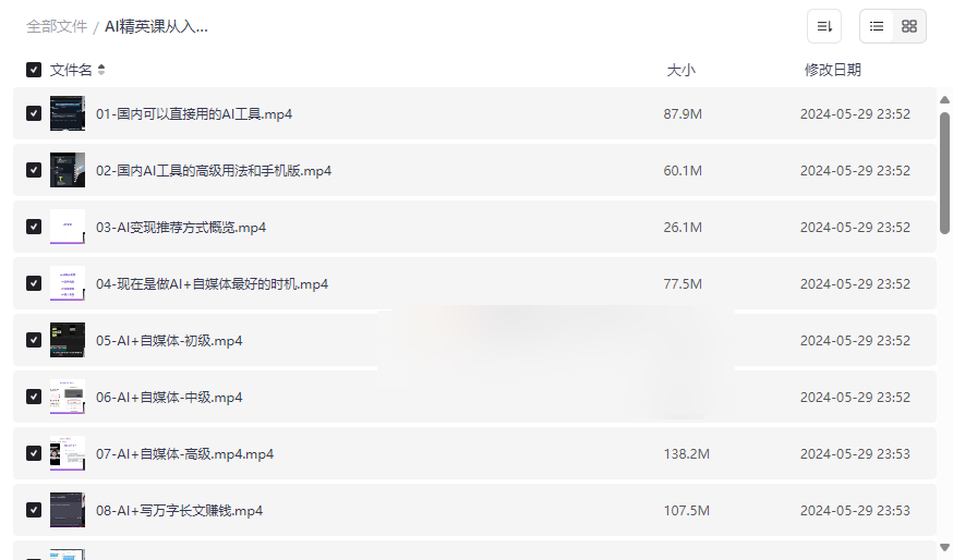 “AI精英课从入门到精通”是一套全面覆盖人工智能应用与变现的实战课程,旨在帮助用户从零基础快速掌握AI工具的使用技巧,并通过丰富的案例实现技能提升与商业变现。本资源集合了 国内AI工具操作指南、自媒体内容创作、论文写作辅助、育儿咨询、数字人直播以及职业发展 等多维度内容,将理论知识与实际应用紧密结合,适合: