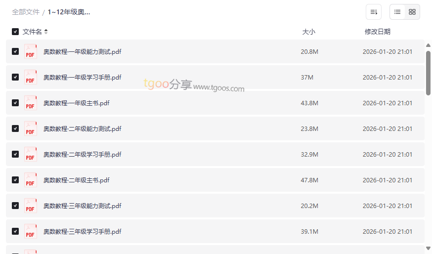 “奥数教程”是国内数学竞赛领域的经典权威教材,以其科学的编排体系和循序渐进的难度设计,深受广大师生信赖。本资源集合了 从小学一年级到初中七年级的完整教程体系,每一年级均包含 主书、学习手册和能力测试 三大核心模块,构成了一套从知识讲解、例题剖析到实战演练的完整学习闭环。这套高质量的奥数网盘资源,不仅是冲击数学竞赛的利器,更是系统提升学生逻辑思维、空间想象和问题解决能力的宝贵素材,适合: