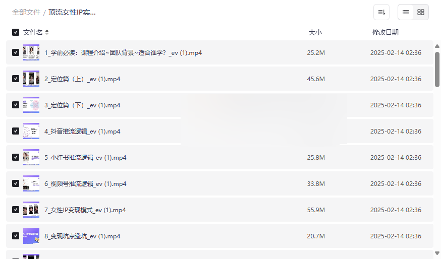 “顶流女性IP实战班”是专为女性内容创作者和创业者打造的高阶实战课程,聚焦流量上亿情绪引爆法与顶流女性IP硬核基本功的深度打磨。本资源全面覆盖从IP定位、平台推流逻辑到变现模式、内容创作技巧、剪辑实操及投放策略的全链路内容,结合抖音、小红书、视频号三大主流平台特性,系统提升女性创作者的品牌影响力和商业价值。课程适合: