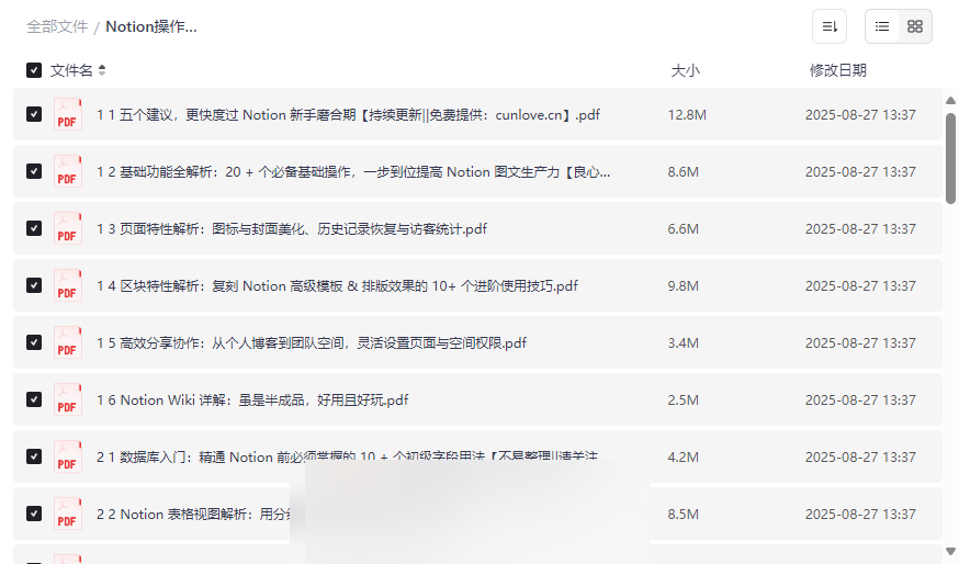 “Notion”作为一款强大的All-in-One工作空间工具,正逐渐成为个人和团队高效协作的首选。本资源集合了 基础操作解析、页面与区块特性、数据库视图详解、高级功能应用 等多维度内容,由“二一的笔记”精心整理,覆盖从新手入门到进阶应用的全流程。这份资源适合: