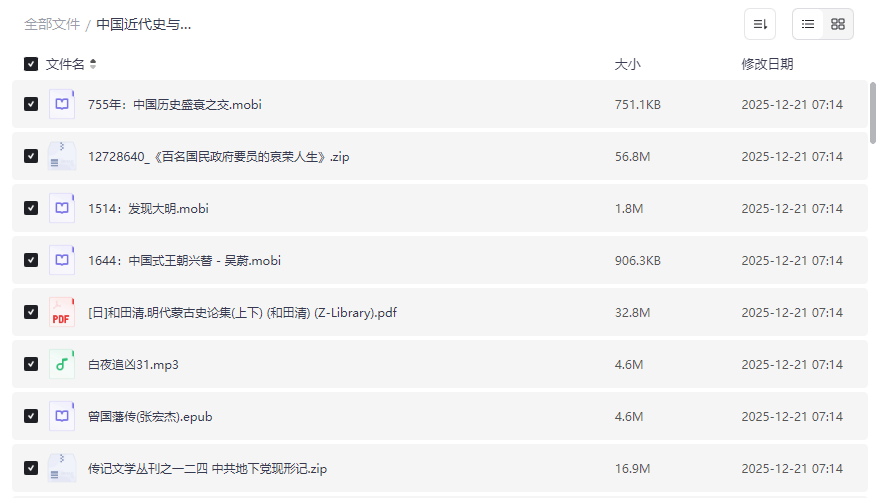 “中国近代史与人物传记”作为深度探索中国历史变迁与关键人物命运的重要领域,一直吸引着众多历史爱好者和研究者。本资源集合了 从明代至民国的重要历史事件分析、关键人物传记、地方城市发展史,以及未公开史料与争议性文献,将严谨的历史研究与生动的个人叙事结合,适合: