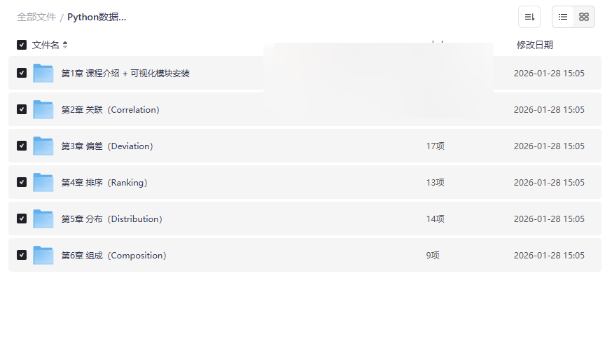 整个课程每个章节都配有对应的IPY文件(Jupyter Notebook课件),方便学习者边看视频边动手练习。课程从环境安装开始,按照“绘制基础图表 -> 添加复杂装饰 -> 深入解读数据”的递进式逻辑设计,确保了学习的连贯性和实效性。这不仅仅是一套Python视频教程,更是一个包含代码、数据、讲解的完整可视化项目实战库。