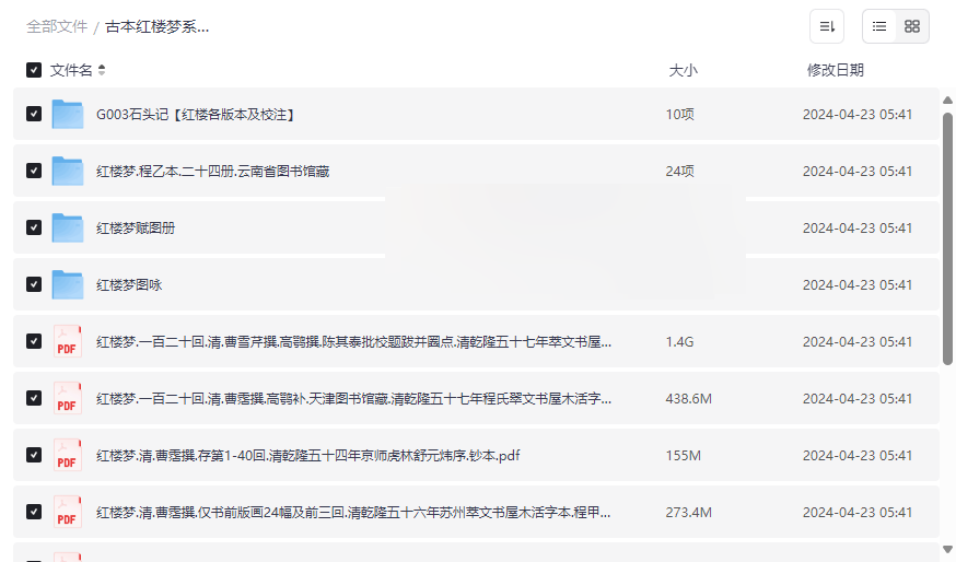 “古本红楼梦系列”作为中国古典文学巅峰之作《红楼梦》的珍贵版本集合,汇聚了多个历史时期的稀有刊本、手抄本及评点本,具有极高的文献与收藏价值。本资源涵盖了 程甲本、程乙本、脂砚斋评本、舒元炜序抄本、绣像插图本、名家评点本及图咏册 等多元版本,不仅呈现了文本流变与版本差异,还融合了丰富的图像与批注材料,适合: