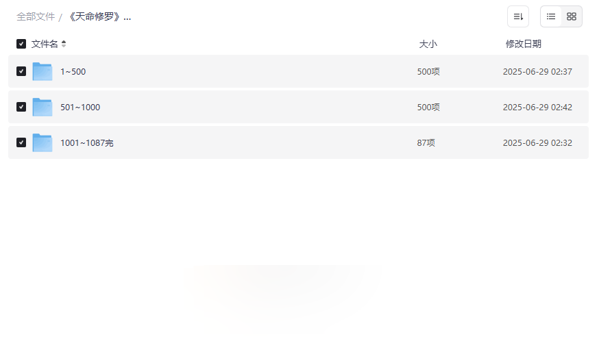 资源按集数分为三个逻辑清晰的文件夹(1~500集、501~1000集、1001~1087集完),便于用户分阶段收听或快速定位特定情节。这种分段管理方式优化了下载和播放体验,避免一次性加载大量文件的负担,特别适合长期追更或复习精彩片段。 - 1~500集 | 剧情铺垫与角色成长,奠定修真基础