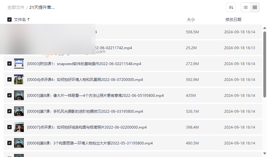 “21天提升营拍出有意境的照片”是一套专为摄影爱好者设计的系统性手机摄影课程,通过21天的集中学习,帮助用户掌握从基础到进阶的摄影技巧,提升照片的意境与艺术感。本资源集合了 核心课程视频、附加软件操作指南、专业点评课以及结营直播 等丰富内容,结合理论与实践,适合: