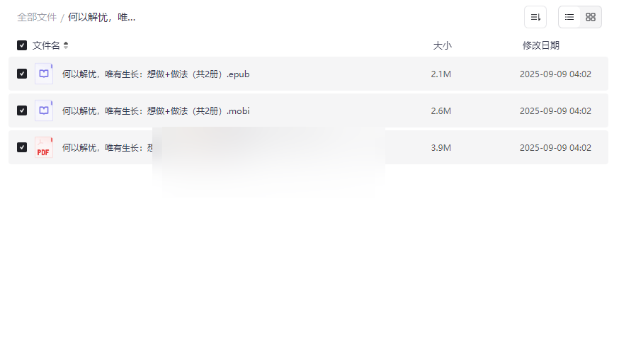 “何以解忧,唯有生长:想做+做法”是一套专注于个人成长与心理建设的实用指南,通过“想做”与“做法”两册内容,系统性地帮助读者从思维转变到行动落地。本资源集合了 EPUB、MOBI、PDF三大主流电子书格式,覆盖多种阅读设备需求,无论是通勤碎片时间还是深度研读,都能提供便捷的学习体验。这套资源特别适合: