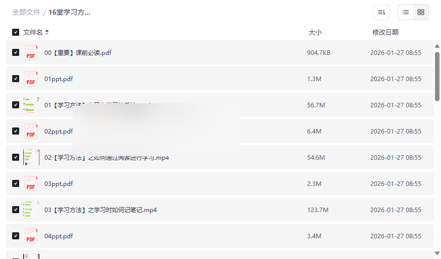 在信息爆炸的时代,拥有高效的学习方法比单纯积累知识更为重要。这份 “16堂学习方法系统课” 资源,正是为渴望突破学习瓶颈、实现个人高速成长的你量身打造。它并非零散的技巧堆砌,而是一套从 “学习方法” 到 “知识管理” 再到 “时间管理” 的完整成长系统。本资源集合了 高清视频课程、配套PPT讲义以及详尽的课前指南,旨在帮助你构建底层学习逻辑,将碎片化信息转化为体系化能力,真正实现事半功倍的学习效果。这套系统课程尤其适合: