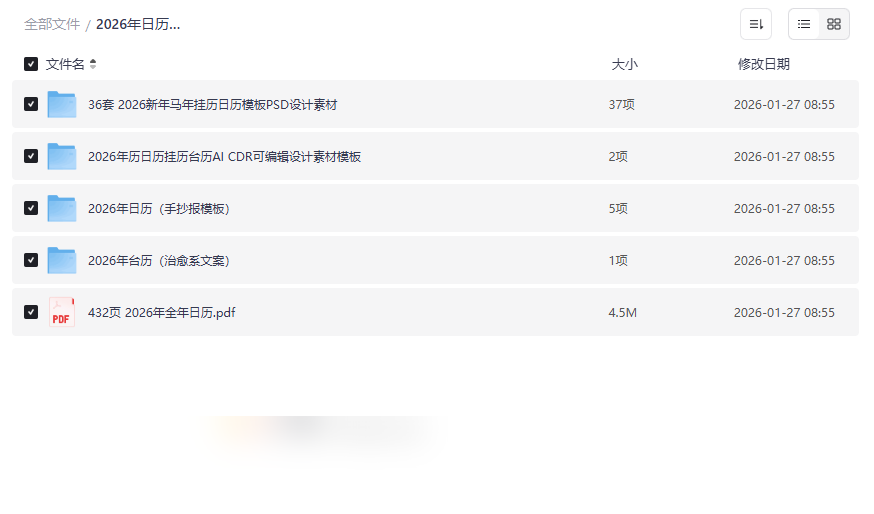 时光流转,提前规划方能从容不迫。这份精心整理的 2026年日历台历挂历素材模板资源,是专为设计师、企业行政、教师、学生及所有热爱生活、注重仪式感的个人准备的年度规划利器。本资源集合了 高达432页的全年日历PDF、36套风格多样的PSD设计模板、AI/CDR可编辑源文件、手抄报模板以及治愈系文案台历 等多维度素材,将实用性与设计美学完美结合,旨在帮助用户高效、个性化地打造属于自己的2026年时间管理工具。无论是用于商业设计、企业礼品、校园活动还是个人生活记录,这份 高质量网盘资源合集 都能提供一站式的解决方案,让规划新年变得既专业又充满乐趣。