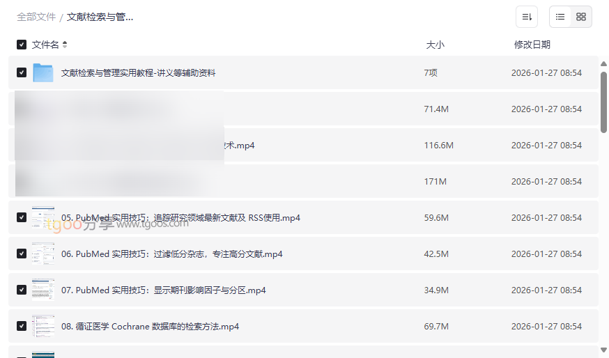 在学术研究的道路上,高效精准地获取并管理海量文献是每一位研究者、学生和专业人士必须掌握的核心技能。本套《文献检索与管理实用教程》资源,正是为此量身打造的系统性学习宝库。课程共包含 38节高清视频教程,并附有完整的PDF讲义与辅助资料,从检索基础理论到各大主流数据库的实战技巧,再到文献管理与分析,构建了一套从入门到精通的完整知识体系。本资源集合了 PubMed、Web of Science、Cochrane、CNKI、Google Scholar 等国内外核心平台的深度解析,将帮助您: