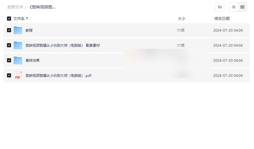 《剪映视频剪辑从小白到大师(电脑版)》是一套全面且实用的视频剪辑学习资源,专为希望掌握专业剪辑技能的用户设计。本资源集合了 系统化视频教程、配套练习素材、最终效果参考以及完整PDF教材,覆盖从基础操作到高级技巧的全方位内容,适合:
