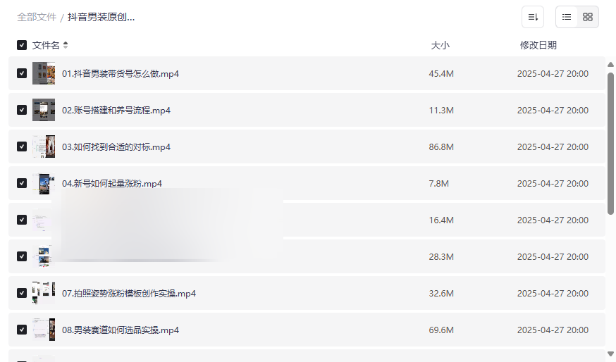 “抖音男装原创带货从0到1爆款”是一套专为希望在抖音平台开展男装带货业务的创作者和商家设计的实战教程资源。本资源集合了账号搭建、内容创作、选品策略、视频剪辑、涨粉技巧、投放优化等全链路实操内容,将理论知识与案例演示深度结合,适合: