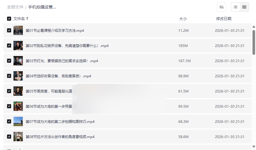 在短视频时代,人人都能成为创作者,但如何用一部手机拍出专业级大片,并成功运营账号实现变现,是许多人的痛点。这份《手机拍摄运营实战课》资源,正是为此量身打造。它系统性地整合了 从设备选购、拍摄技巧、实战剪辑到账号运营、爆款打造 的全链路知识,通过 美食、好物、生活、旅拍、口播 等热门赛道的真实模拟,将理论与实操紧密结合。本资源旨在帮助学习者绕过弯路,用最低的成本(一部手机)掌握最高效的创作与运营方法,适合: