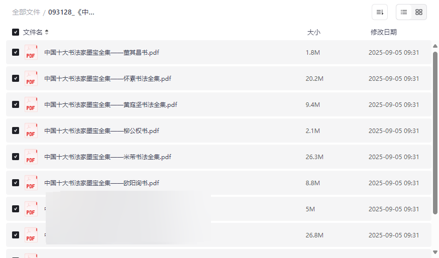 “中国十大书法家墨宝全集”作为一部汇集中国书法史上最具影响力的十位书法大师经典作品的珍贵资源,为书法爱好者和研究者提供了前所未有的学习与研究便利。本资源完整收录了王羲之、颜真卿、柳公权、欧阳询、苏轼、黄庭坚、米芾、赵孟頫、怀素、董其昌等书法大家的代表作品,以高清PDF格式呈现,堪称一部移动的书法艺术宝库。这套资源特别适合: