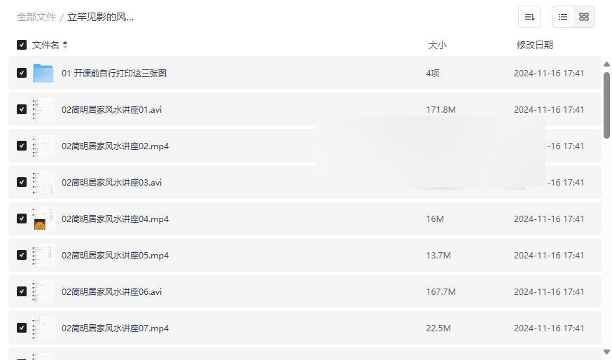 核心教学资源,覆盖从基础到进阶的风水知识,每节视频聚焦一个特定主题,如方位选择、家具摆放、色彩搭配等。视频格式多样(AVI与MP4),兼容不同设备播放,方便随时随地学习。 - 讲座01-10 | 风水基础与居家入门