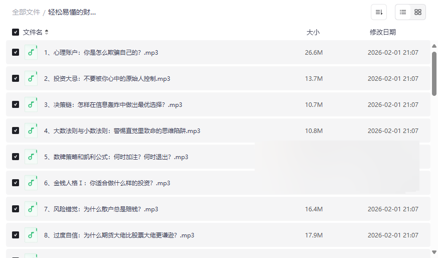 在瞬息万变的金融市场中,知识固然重要,但决定成败的往往是投资者的心智模式与行为习惯。本套《轻松易懂的财商课》正是这样一份直击核心的投资心理学实战指南。它并非枯燥的理论堆砌,而是通过36节精心设计的音频课程,系统剖析了从“心理账户”、“风险错觉”到“芒格智慧”等关键心理陷阱与思维模型。本资源集合了行为金融学精髓、巴菲特股东大会见闻、心智修炼访谈等多维度内容,将深奥的投资哲学转化为可听、可学、可用的日常思维训练,旨在帮助每一位学习者重塑金钱观,成为更理性、更从容的经营与赚钱达人。这套高质量网盘资源尤其适合: