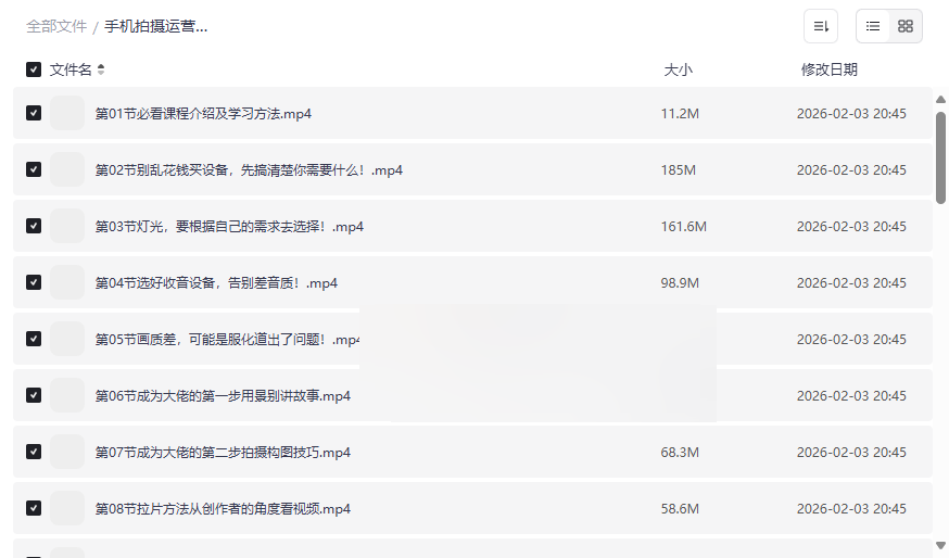 在短视频内容为王的时代,掌握手机拍摄与运营的核心技能已成为个人创作者和品牌方脱颖而出的关键。本套《手机拍摄运营各赛道实战课》资源,正是为这一需求量身打造的系统性解决方案。它从 “设备选择、灯光收音、拍摄构图” 等底层技术,到 “美食、好物、旅拍、口播” 等热门赛道的实战演练,再到 “账号搭建、爆款选题、运营变现” 的完整闭环,提供了一条从0到1、从1到N的清晰成长路径。这套高质量网盘资源合集的价值在于,它摒弃了华而不实的理论,直击创作与运营中的真实痛点,让学习者能够即学即用,快速上手。