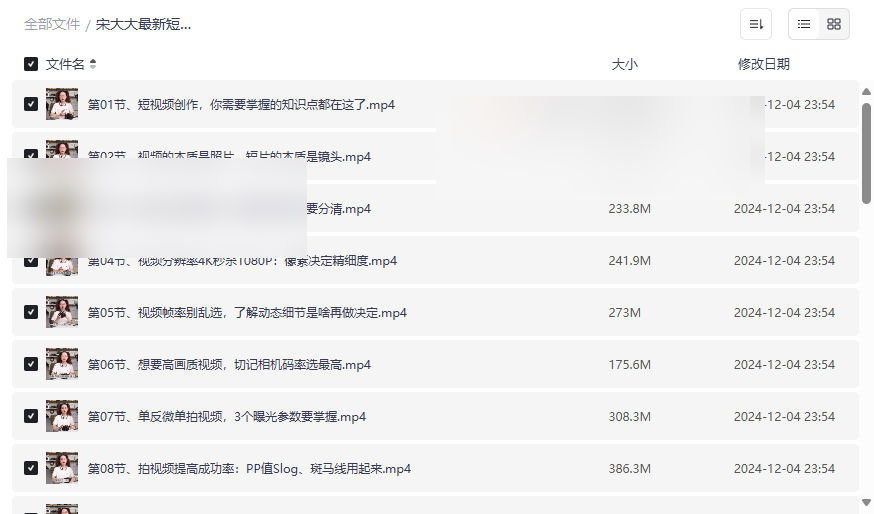 “宋大大最新短视频摄影课程”是一套专为短视频创作者量身打造的实战教学资源,通过 从0到1的现场演示方式,系统拆解视频创作全流程。本课程覆盖了短视频拍摄的核心知识点,包括设备操作、参数设置、运镜技巧以及后期基础,帮助学员快速跨越入门门槛,掌握专业级的视频制作能力。无论你是刚接触视频创作的新手,还是希望提升拍摄质量的爱好者,这套课程都能提供直观、实用、易上手的学习体验。