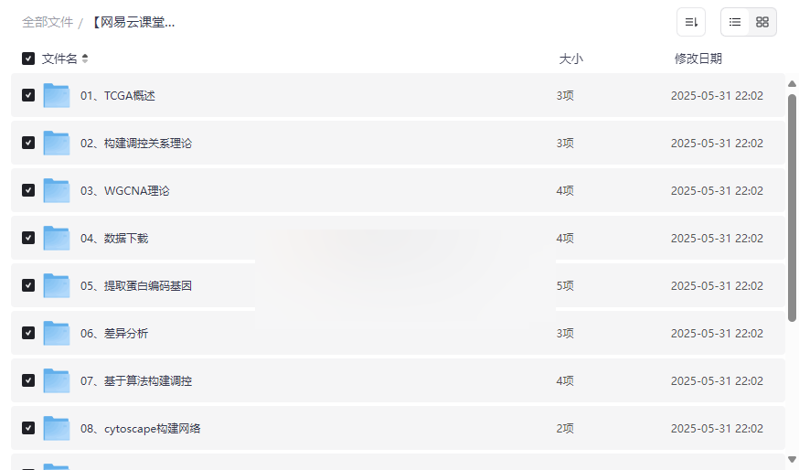 “数据挖掘—miRNA调节网络的构建”是生物信息学领域的重要课题,本资源来自网易云课堂,系统性地讲解了从TCGA数据获取到miRNA调控网络构建的全流程。课程结合理论与实操,涵盖了TCGA数据库概述、WGCNA理论、差异分析、算法构建调控、Cytoscape网络可视化等核心模块,并附带配套代码,为学习者提供一站式解决方案。适合: