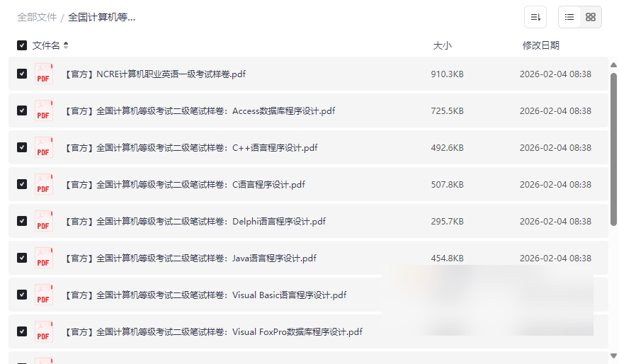 整体亮点:本资源最大的优势在于其官方性与完整性。所有样卷均为PDF格式,清晰易读,省去了考生四处搜寻、资料良莠不齐的烦恼。一站式获取全级别样卷,便于考生纵向了解NCRE全貌,制定长期考证规划。