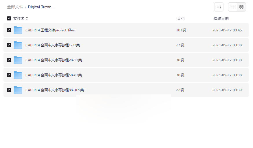 Cinema 4D R14 作为三维设计与动画制作领域的重要工具,在全球创意工作者中享有盛誉。本资源集合了 Digital Tutors 出品的109集全面中文字幕教程、配套工程文件、分阶段学习模块 等完整素材,将专业三维软件学习与中文教学支持完美结合,适合: