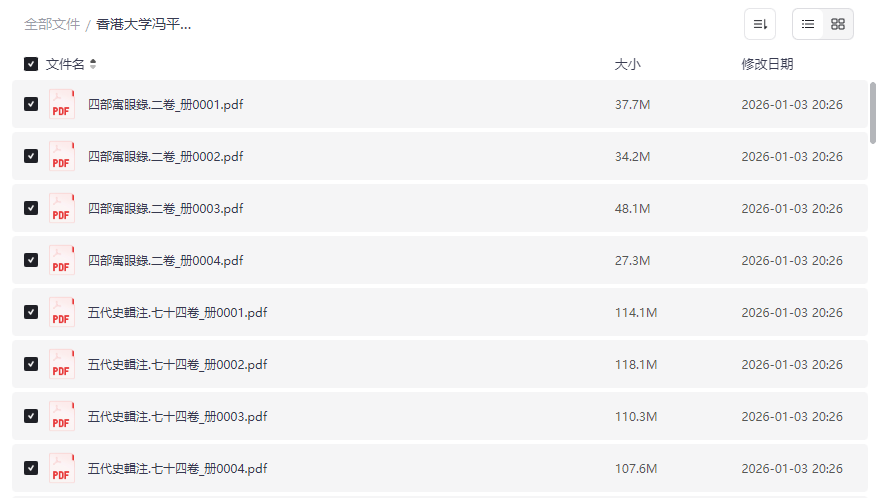 香港大学冯平山图书馆作为香港重要的学术文献宝库,收藏了大量珍贵的历史典籍与学术著作。本资源精选了1025册馆藏古籍,涵盖经史子集等多个领域,包括《四部寓眼录》、《五代史辑注》、《楚漕江程》等经典文献的完整数字化版本。这些资源不仅保留了原版文献的排版与内容,还通过高清PDF格式实现了便捷的电子查阅,适合:
