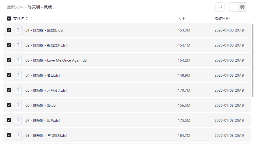专辑完整收录了陈慧娴巅峰时期的11首代表作,每一首都是粤语流行乐坛的里程碑。《跳舞街》 以其动感节奏成为迪斯科经典,《痴情意外》 则展现了陈慧娴深情的抒情演绎,而 《反叛》 作为标题曲,更是以其强烈的个人风格成为乐迷心中的不朽之作。 - DSD DSF高解析音质