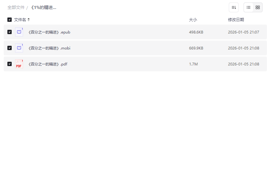 《1%的精进》是一本专注于效率提升与个人优化的实用指南,通过系统化的时间管理方法和自我优化策略,帮助读者实现持续进步。本资源集合了 高清电子书、多格式阅读版本以及配套学习资源,将理论与实操结合,适合: