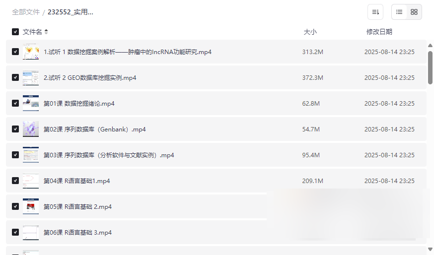 “实用数据挖掘”作为现代科研与数据分析的核心技能,在生物信息学、医学研究及数据科学领域具有广泛应用。本资源集合了从基础理论到实战案例的全套课程,涵盖R语言编程、GEO数据库操作、差异表达分析、功能富集分析及可视化工具等关键模块,将抽象的数据挖掘概念转化为可操作的实践技能。适合: