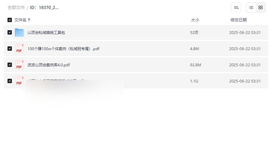 “2025最新搞钱合集”作为一套实战导向的私域变现系统资源,汇集了山顶会多年沉淀的私域运营核心方法论与工具模板。本资源包含私域搞钱工具包、100个百万级个体案例、波波山顶会案例库4.0、山顶牛人兵器库等重磅内容,覆盖从引流、转化到团队管理的全链路实操指南,适合: