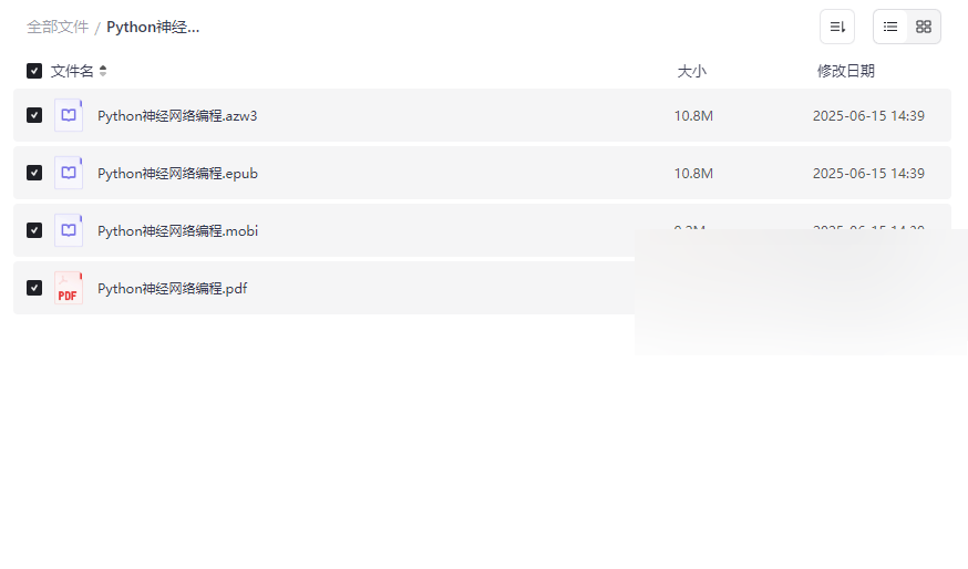 “Python神经网络编程”作为人工智能领域的入门经典,为初学者和开发者提供了从零构建神经网络的完整路径。本资源集合了 多格式电子书(PDF、EPUB、MOBI、AZW3),全面覆盖不同设备的阅读需求,将理论知识与代码实践无缝结合,适合: