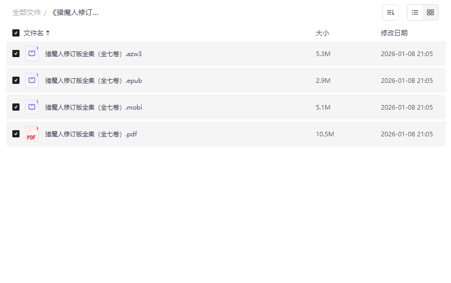 《猎魔人修订版全集》作为波兰国宝级奇幻文学大师安杰伊·萨普科夫斯基的巅峰之作,以其宏大的世界观和深刻的人性探讨风靡全球。本资源精心整合了全七卷完整修订版内容,提供AZW3、EPUB、MOBI、PDF四种主流电子书格式,满足不同设备阅读需求。这套修订版不仅修正了早期版本的翻译误差,更补充了作者独家修订内容,堪称收藏级版本。特别适合: