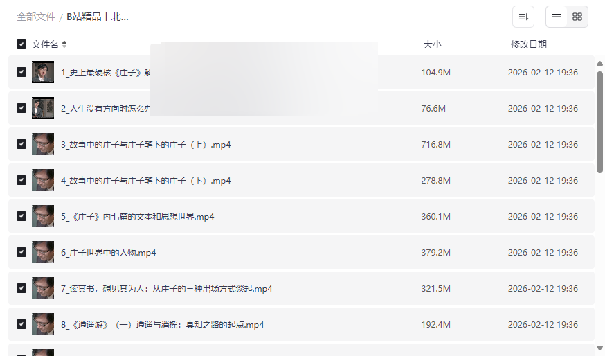 《庄子》作为道家思想的瑰宝,其深邃的哲学思辨与汪洋恣肆的语言艺术,历来是理解中国智慧的重要门径。本资源汇集了 北京大学哲学系杨立华教授在B站广受好评的《庄子》哲学精讲课程(完结全集),共19讲。杨教授以其深厚的学术功底、清晰的逻辑脉络和生动的现代诠释,将这部古典巨著讲得通透易懂,堪称 “史上最硬核的《庄子》解读”。本资源不仅还原了庄子这位伟大先哲的精神世界,更为现代人提供了应对人生困惑的哲学智慧。这套高质量网盘资源合集适合: