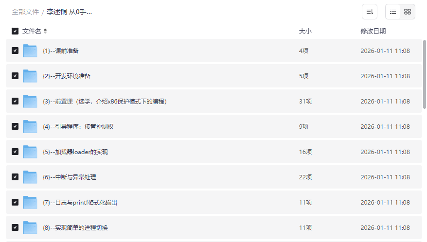 “从0手写操作系统”是计算机科学领域最具挑战性的学习项目之一,能够深入理解计算机系统的底层原理。本资源由李述铜老师精心打造,完整覆盖x86架构、保护模式、进程管理、虚拟内存、系统调用、文件系统等核心概念,通过18个循序渐进的教学模块,带领学习者从零构建一个功能完整的Linux风格操作系统。这套资源特别适合: